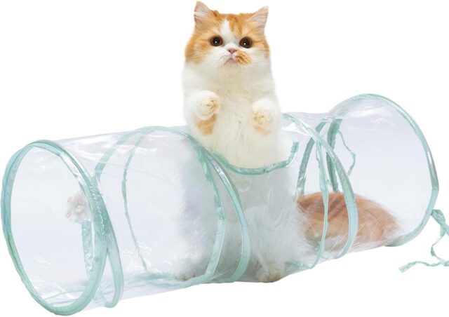 中に入るとカシャカシャと音が鳴る素材で作られており、猫が飛び込んだり駆け抜けたりするたびに好奇心を刺激します。単調になりがちな室内遊びでも変化が生まれ、日常的に使いやすい遊具です。